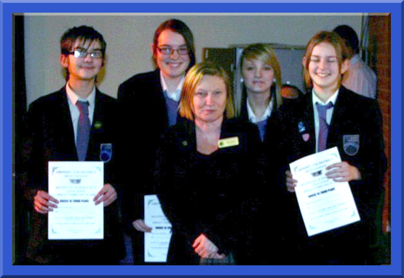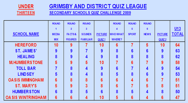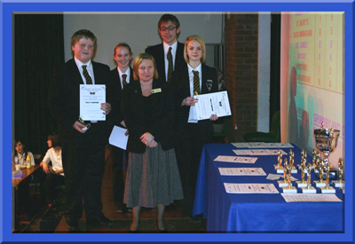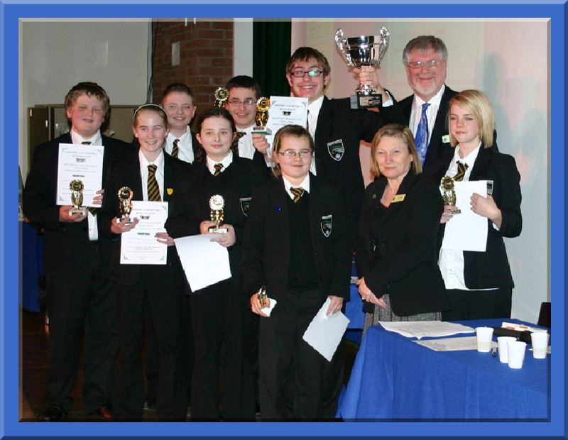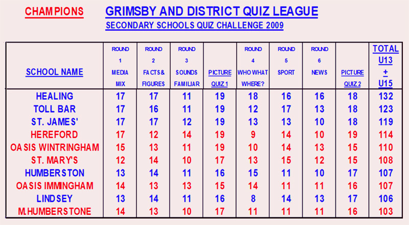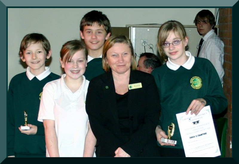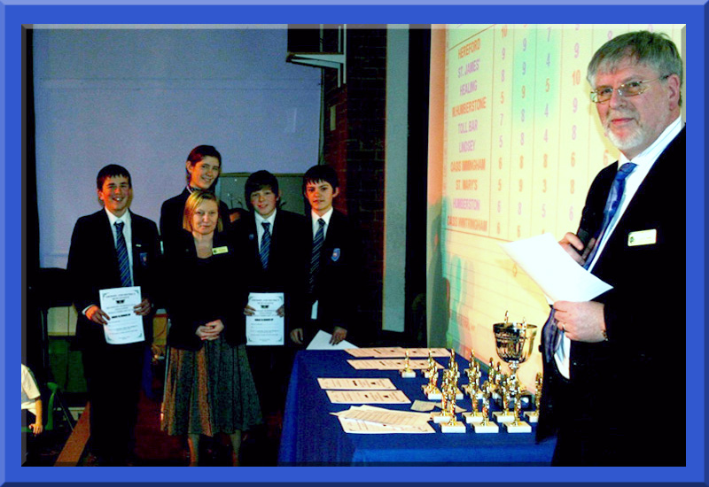 There were entries from all 12 secondary schools and the winners, Healing, received a cheque for £100, the Champions' trophy, personal trophies and certificates. They scored 132 points. Runners-up with a cheque for £50 were Toll Bar (last year's champions) with 123 points. St James' came third with 119 points and Hereford fourth with 114 points. Under 15 winners were Healing with 70 points, second were Toll Bar with 69 and third were Wintringham with 63. In the Under 13 contest, Hereford won with 64 points, St James' were second with 63 points, and Healing came third with 62 points. |